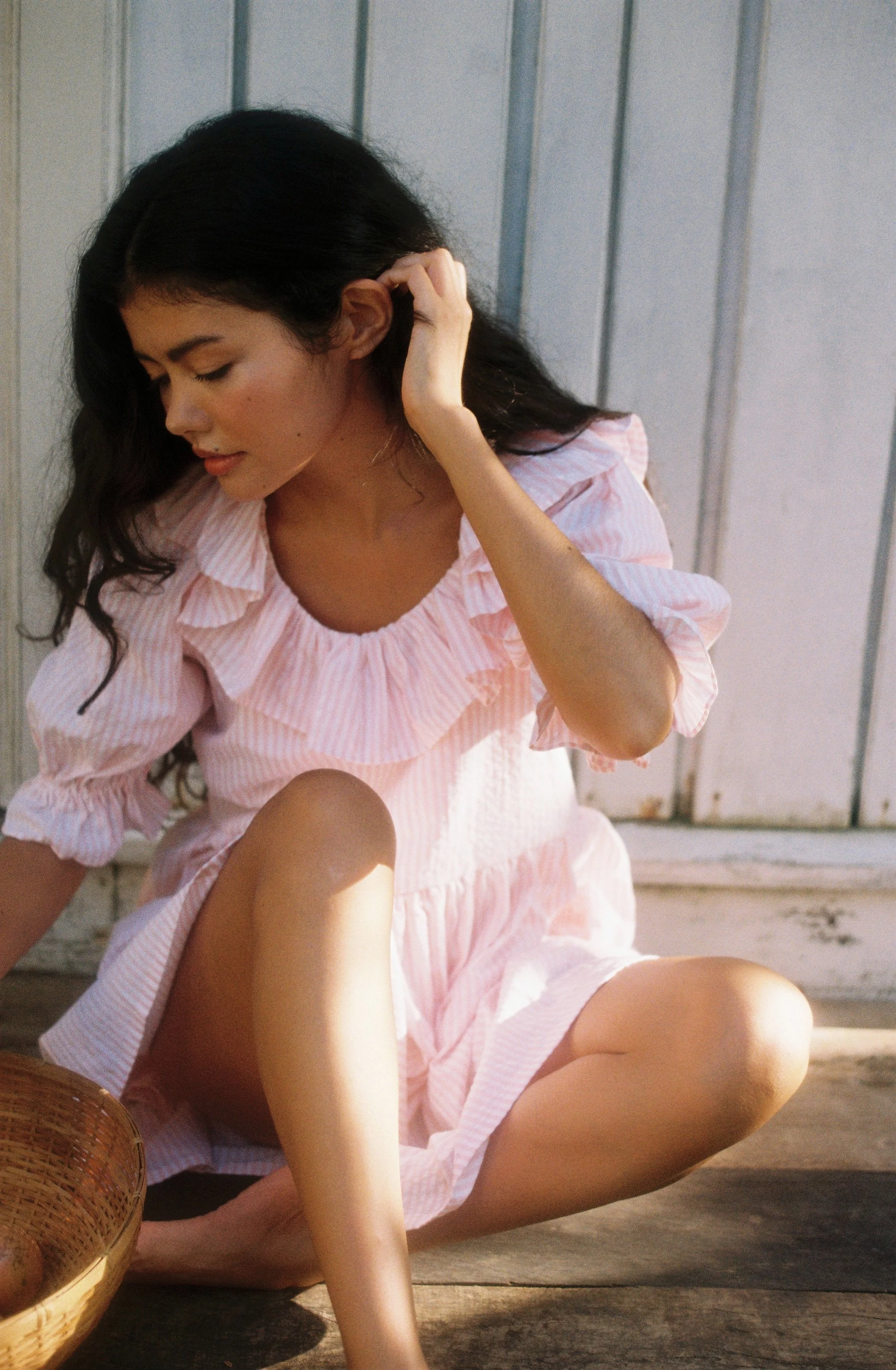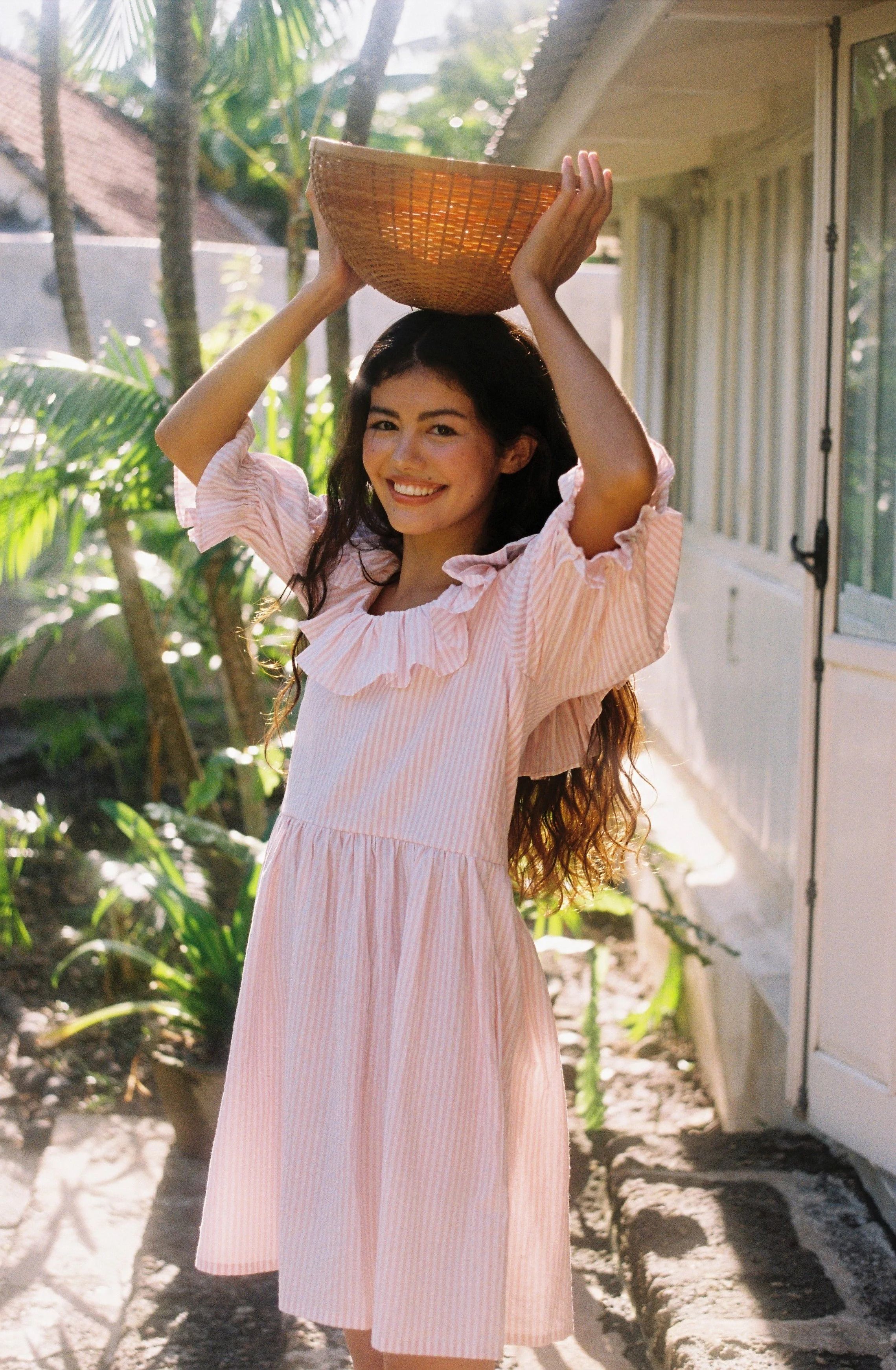 - The Mazey dress is made in pink stripe 100% organic cotton